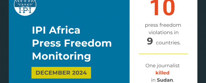 In December 2024, IPI’s Africa monitoring program recorded at least 10 incidents of threats to press freedom in nine countries across sub-Saharan Africa. These included six incidents of physical, verbal, or online attacks, including the killing of one journalist, in Sudan. Once again, state actors remained the main perpetrators, responsible for nearly all of the incidents … Continue reading Africa Media Monitoring December 2024: Threats to press freedom in Sudan, Guinea and Liberia