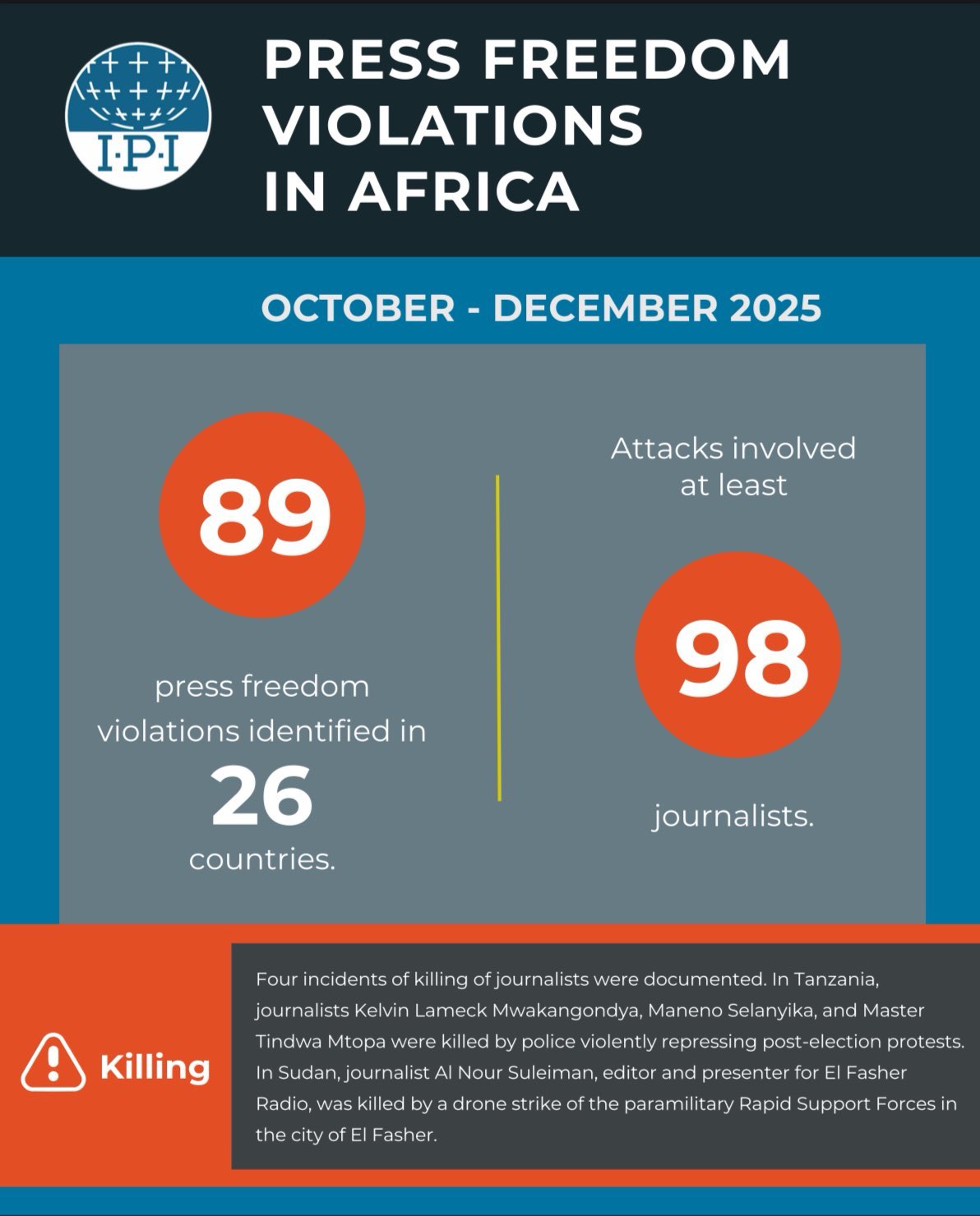IPI’s Africa monitoring programme documented at least 89 incidents of threats to press freedom across 26 countries in sub-Saharan Africa between October and December 2025. These threats included the killings of three journalists in Tanzania amid post-election protests and one during the ongoing civil conflict in Sudan.
