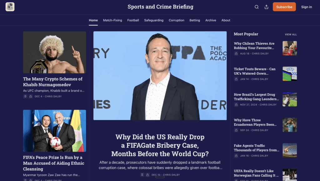 I started working with Chris in June 2025, when his newsletter „The Sports & Crime Briefing“ had just turned eight months old. In that short period, he had already built an impressive audience of 6,000 subscribers – mostly free ones working in or around the sports industry.