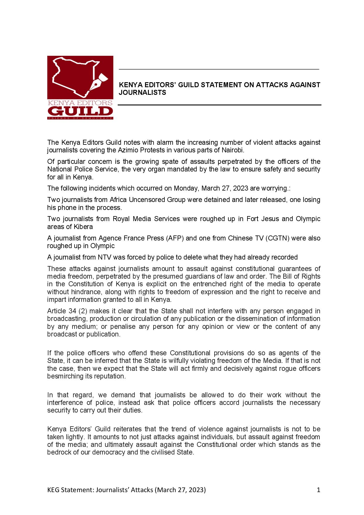 The Kenya Editors Guild condemned the assaults as a violation of the constitutional rights of media freedom and called on police to refrain from interfering with these rights. The MCK also condemned the incidents and demanded that those responsible be held to account.